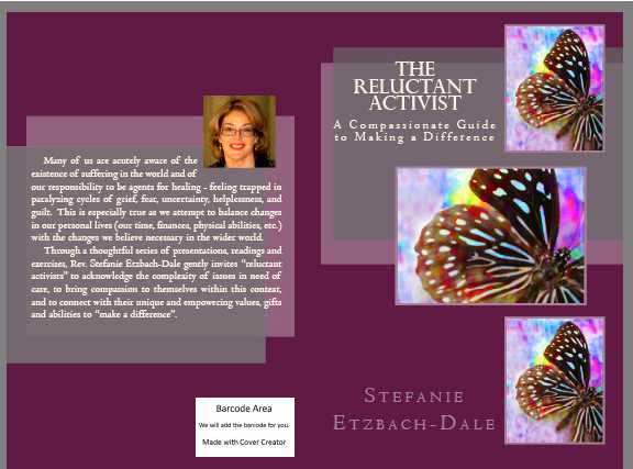 The second book, The Reluctant Activist: A Compassionate Guide to Making a Difference, is in progress. It draws from a series of workshops I presented. It is geared toward those who may feel overwhelmed by the responsibility to make a difference in the world, especially while attempting to balance changes in their personal lives (time, finances, physical abilities, etc.) – offering insight into and encouragement towards authentic, meaningful, sustainable activism.